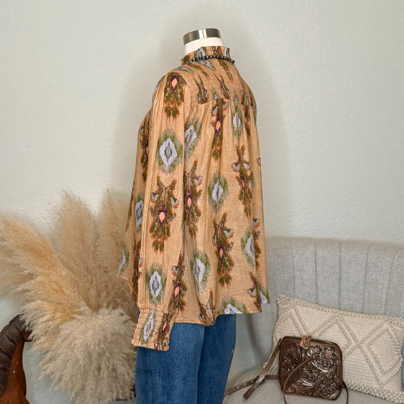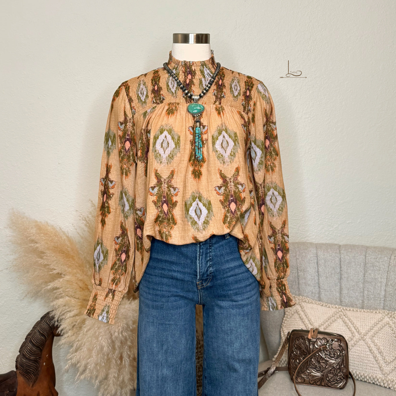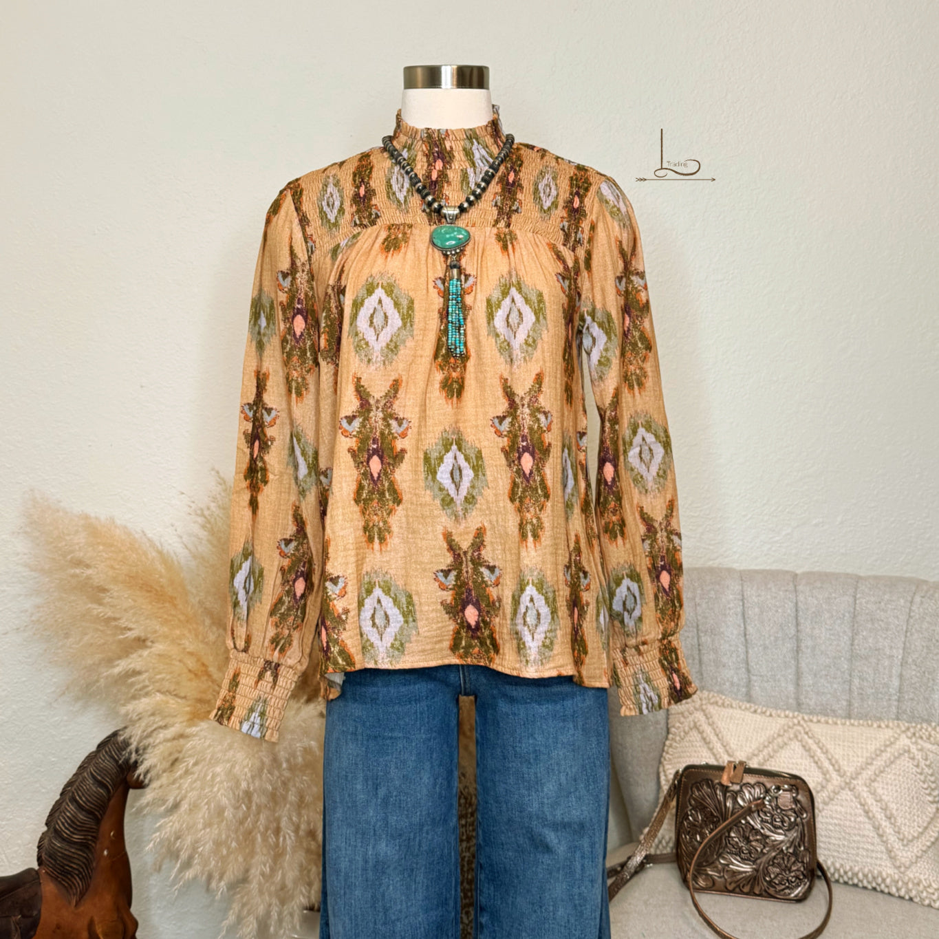 The Lauren ~She's a pretty one for your closet with all the details! Rich warm colors & patterns with Smocked elastic yolk for that something extra ~ Shown with our Handmade Sterling Silver Pearl Necklace with Turquoise Tassel Pendant set, Harley Wide Leg Jeans w/Tummy Control, The Catalina Tooled Leather Crossbody in Metallic Bronze