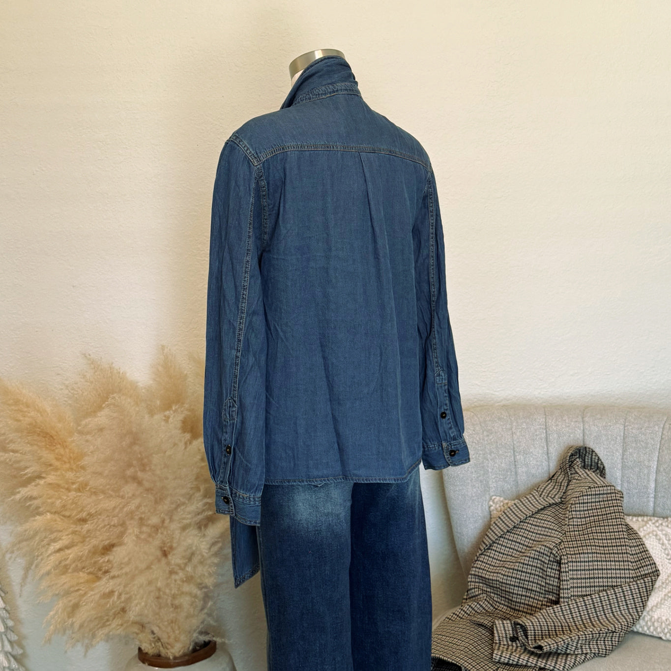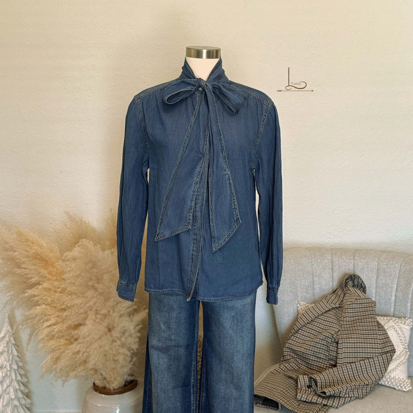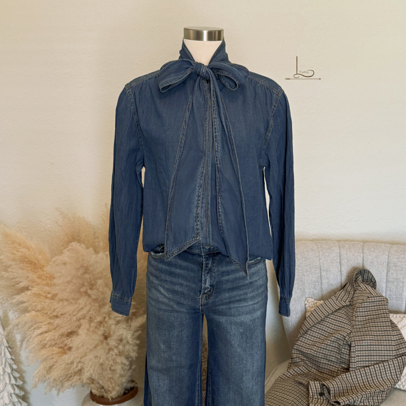 The McCall ~Trending Bow/Tie Neckline in a Dark Wash Denim for a Classic Look. Super soft Denim too~ Shown with our Kinsey Straigth Leg Dark Wash Jeans w/stretch & The Cullen Plaid Blazer