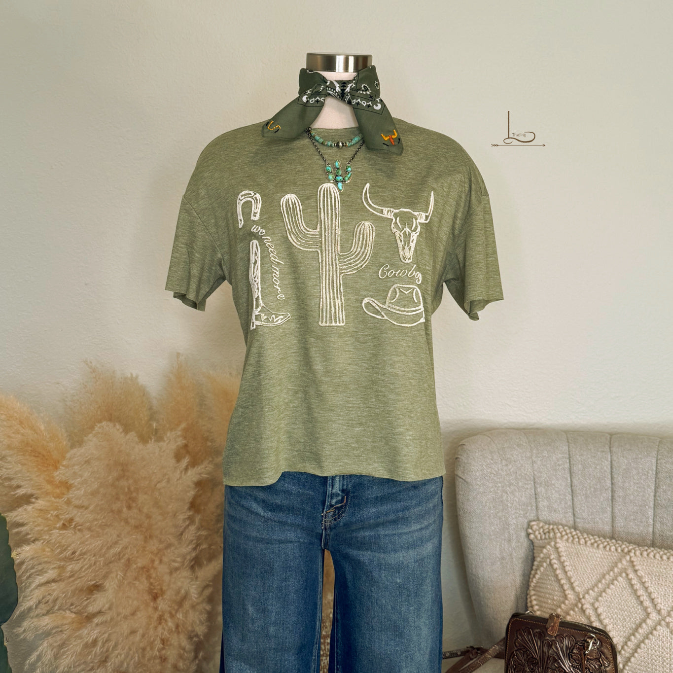 We Need More Cowboys Tee ~ This one has All the Western Retro Vibes on a loose fit Tee. Layer for the cooler temps for more chances to wear! ~ Shown with our Embroidered Cattle Call Bandana in Olive, The Graduated Kingman Turquoise & Sterling Pearl Necklace, The Sonoran Turquoise Cactus Necklace & The Kinsey Straight Leg Jeans w/stretch