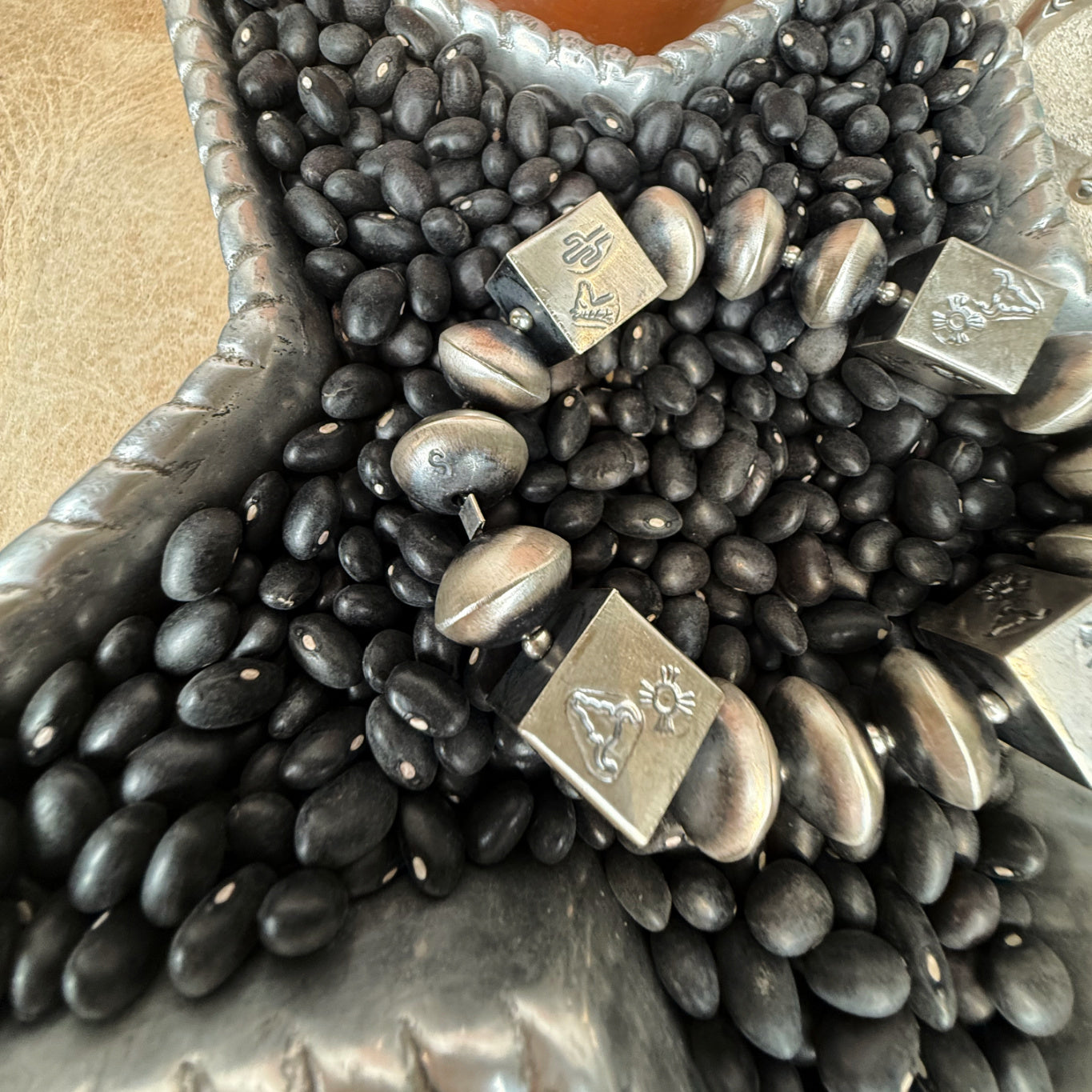 Sterling Silver Square Handstamped Pearl Bracelet ~ Gorgeous Unique Square Pearls with Stamped Horse, Longhorn & Cactus detail sets this one apart. Love the easy on & off stretch too! ~Shown with The Thomas Grande Sterling Silver Dome Cuff & The Sterling Silver Statement Maker Ring