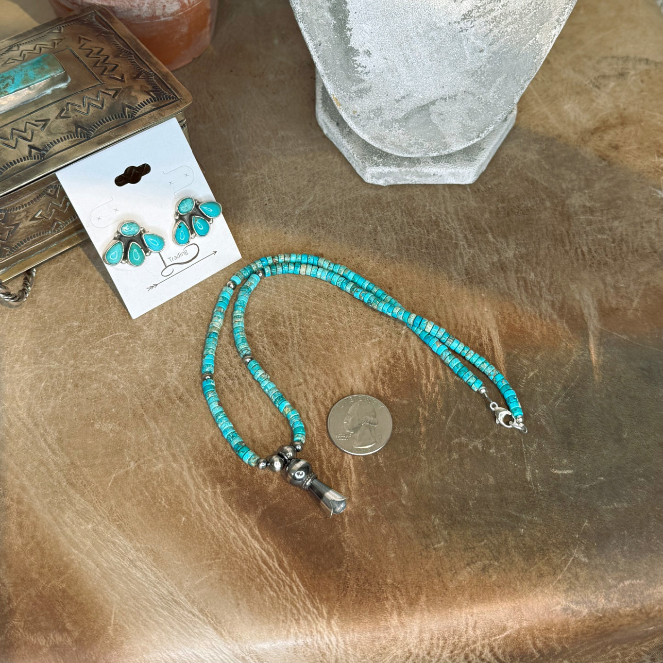 Turquoise & Sterling Silver Squash Blossom Necklace ~ That Perfect touch of color for everyday wear. Makes a Great Stack too! ~Shown with our Pequena Turquoise Cluster Earrings