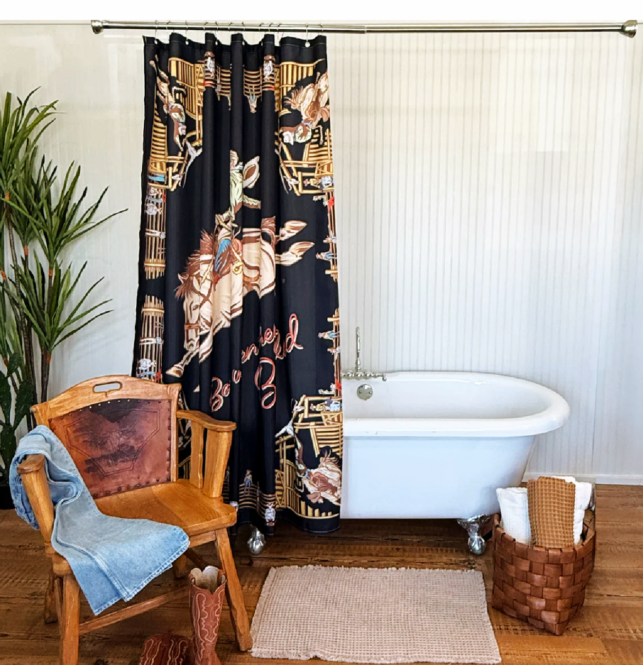 Back When They Bucked Shower in Black ~ A tribute to the rodeo’s golden era—think 1940s–50s bronc riders, bucking chutes, and mid-century swagger~ It's the details that sets your home apart!