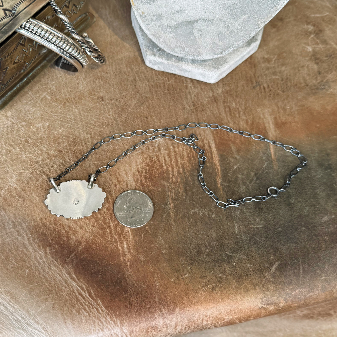 The Kingman Turquoise Necklace ~ Soft Green Turquoise Pendant on a Classic Sterling Silver Chain is a Great piece for everyday wear. Makes a Great Stack too! ~Shown Sterling Silver Rope Cuff