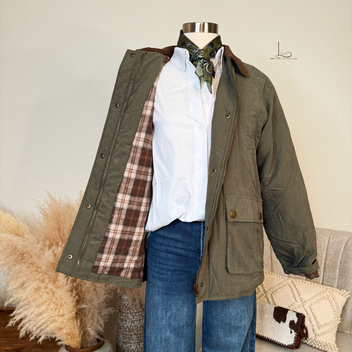 The Barn Coat in Olive ~ Barn Coats are Trending for Fall/Winter. This one is loaded with details, Brown Corduroy Collar, Super Soft Plaid Quilted lining to name a few. ~Shown with our Updated White Shirt, The Turqs & Conchos Silk Shorty Wild Rag, Harley Wide Leg Jeans w/Tummy Control & The Rancher's Wife Cowhide Organizer, Crossbody, Wristlet