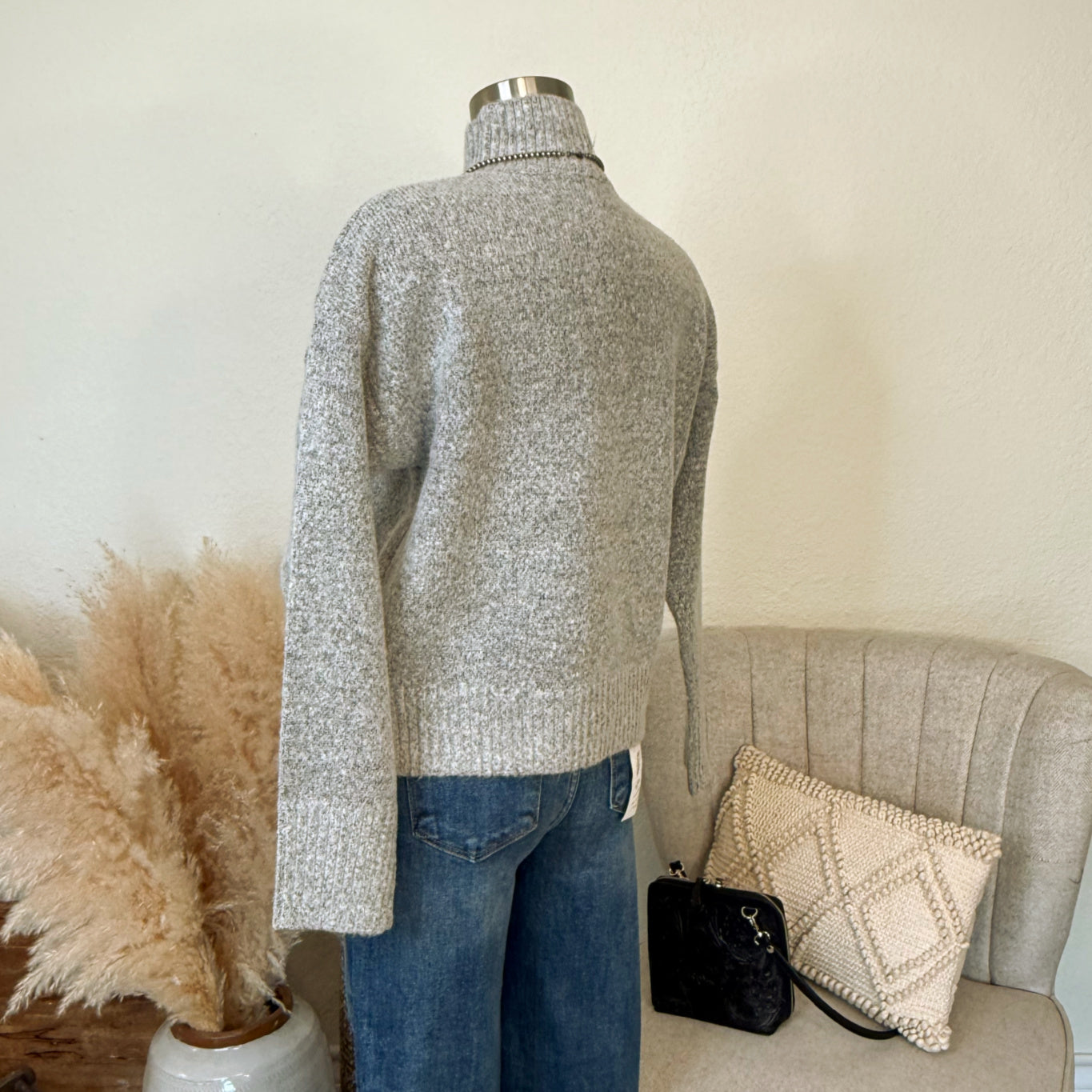 The Jess Mock Neck in Heathered Grey ~ Cozy Knit in a Soft Heathered Grey in a Classic Fit & Style! Plus a little stretch for comfort ~ Shown with our 5mm 30" Sterling Silver Pearls with Turquoise & Sterling Squash Blossom Pendant, Harley Wide Leg Tummy Control Jeans & The Catalina Tooled Leather Crossbody in Black