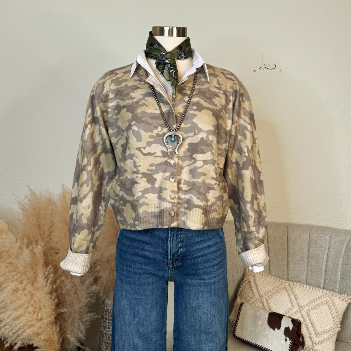 The Vintage Camo Cardigan ~ Soft Muted colors greens, taupe & grey in this super soft lightweight knit. Great for all seasons too! Wear buttoned as a sweater or open as a cardigan ~shown with our Updated Classic White Shirt, The Turqs & Conchos Silk Shorty Wild Rag, The Harley Wide Leg Tummy control Jeans, 6mm 30" Sterling Pearls w/Sterling Turquoise Hook Over Naja PendantÂ