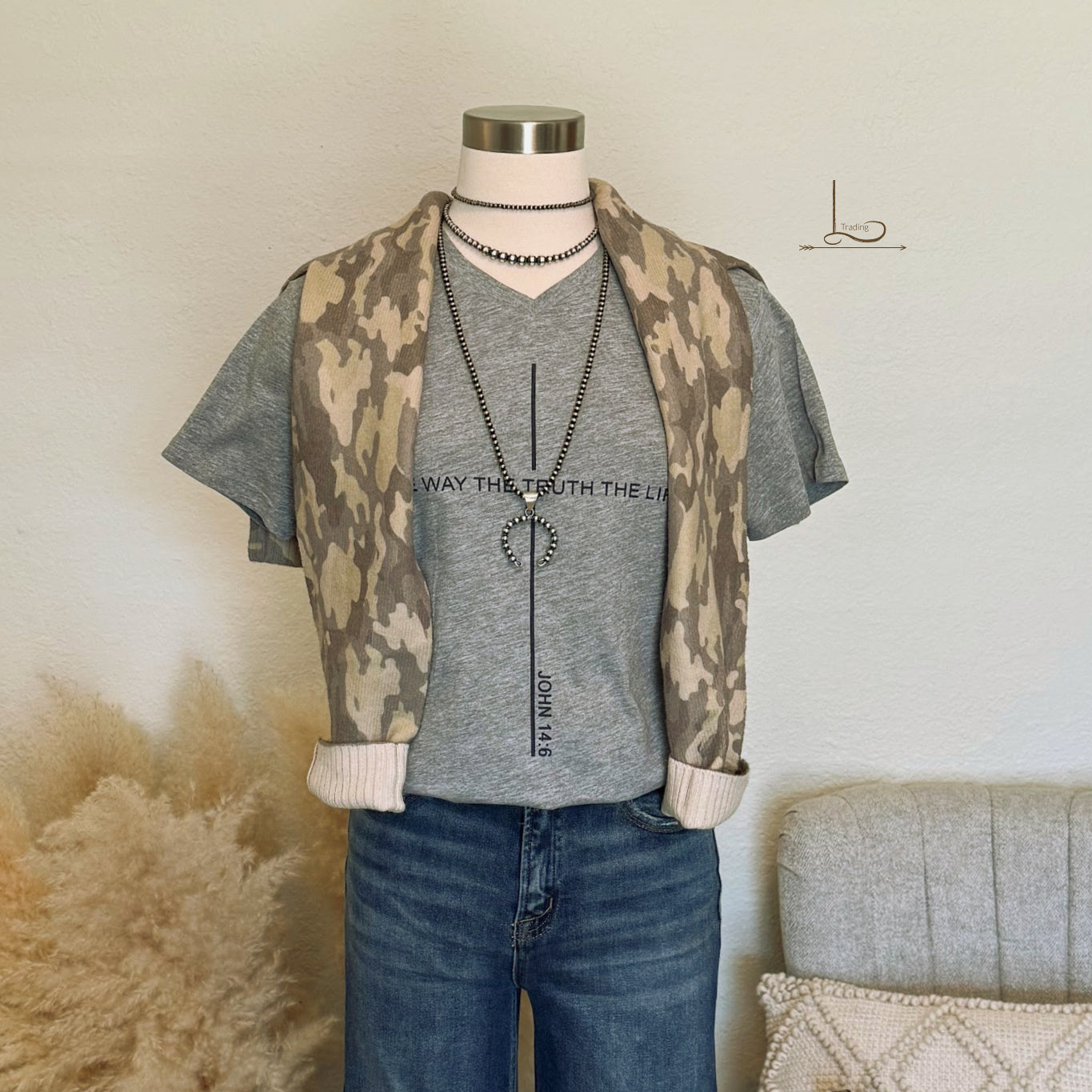 THE WAY Graphic Tee ~ The Way The Truth The Life John14:6 faith message on a classic neutral light heathered gray. Great for year round wear.. just layer for the cooler temps!