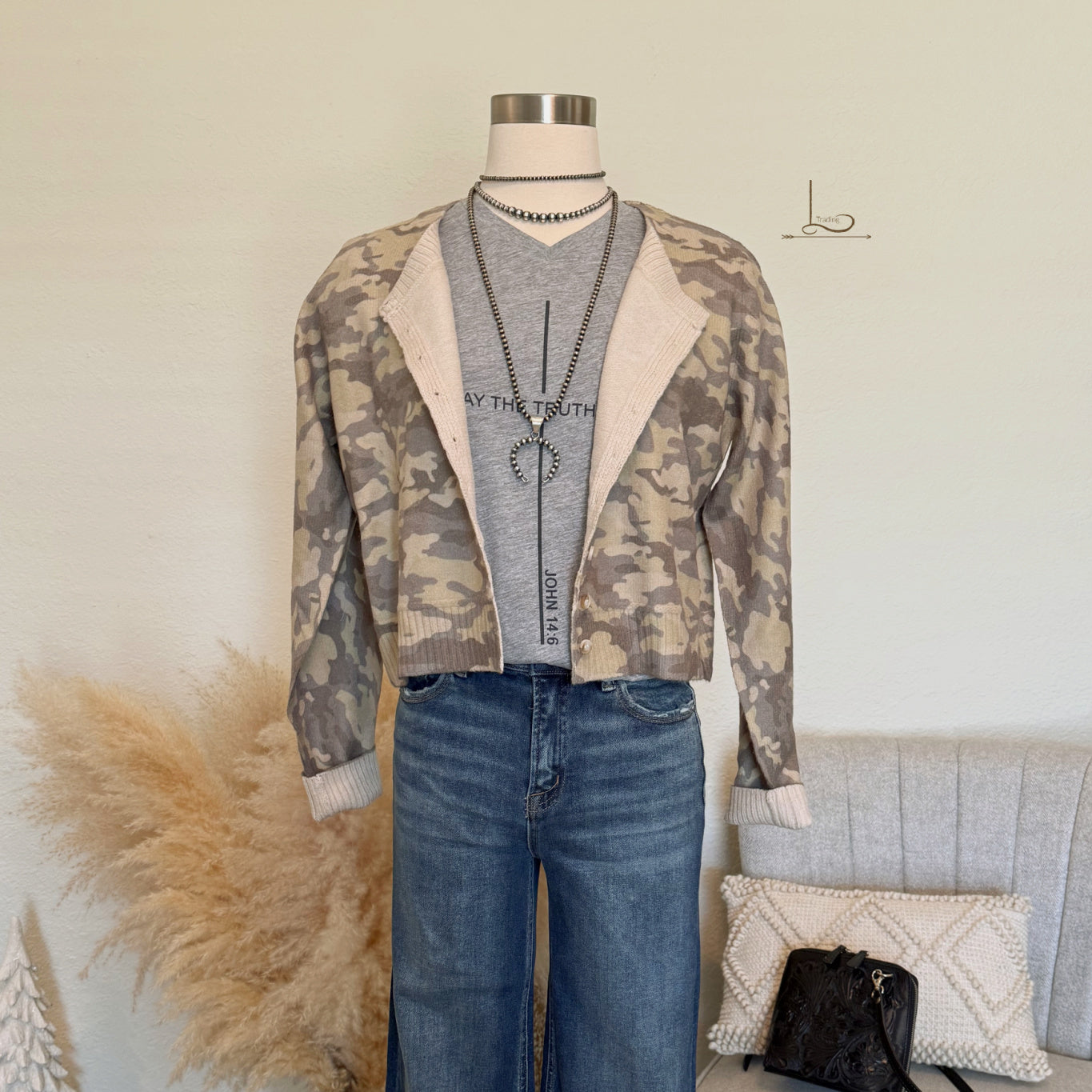 Shown with our Kinsey Straight Leg Jeans w/stretch, Silver Pearls Memory Wire necklace, Graduated Sterling Silver Necklace, 5mm 30" Sterling Silver Necklace with Sterling Naja Pendant & Vintage Camo Cardigan