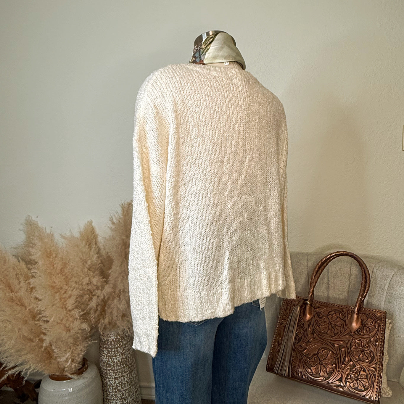 TEXAS Sweater in Cream ~ Hey Texas! Fun Lightweight Loose knit Sweater will be a Fave!! Just throw on & go! ~Shown with The Haute Horse Silk Shorty Wild Rag, 6mm 36" Sterling Silver Pearls w/ Turquoise Longhorn Pendant, The Harley Jeans & The Tooled Leather Marcos Tote in Metallic Bronze