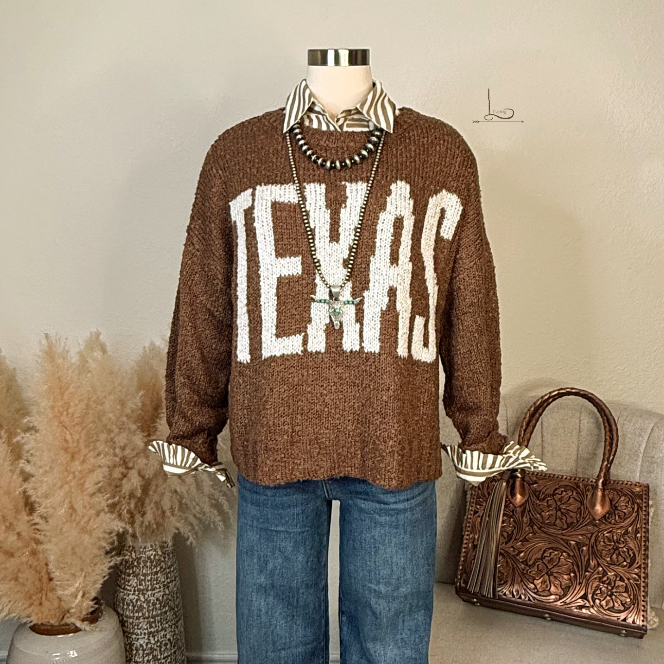 TEXAS Sweater in Mocha ~ Hey Texas! Fun Lightweight Loose knit Sweater will be a Fave!! Just throw on & go! ~Shown with The McKenzie Striped Top, Sterling Silver Saucer Pearl Necklace/Bracelet/Earring set, 6mm 36" Sterling Silver Pearls w/ Turquoise Longhorn Pendant, The Harley Jeans & The Tooled Leather Marcos Tote in Metallic Bronze