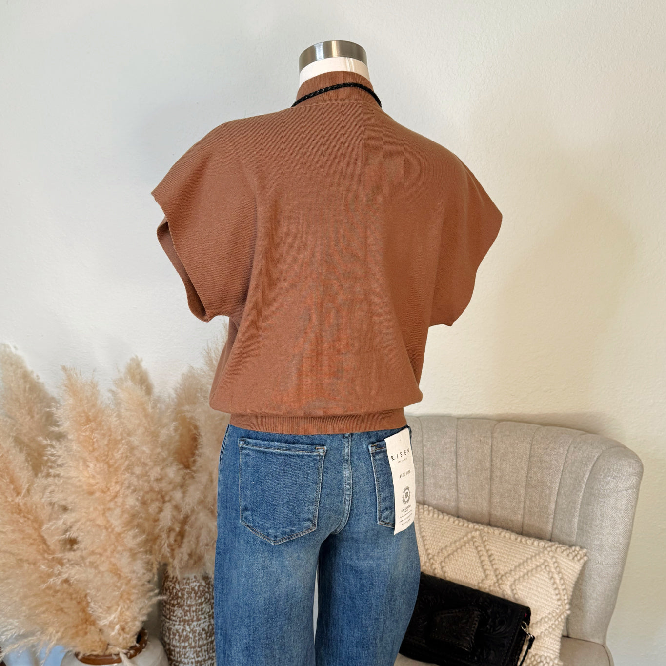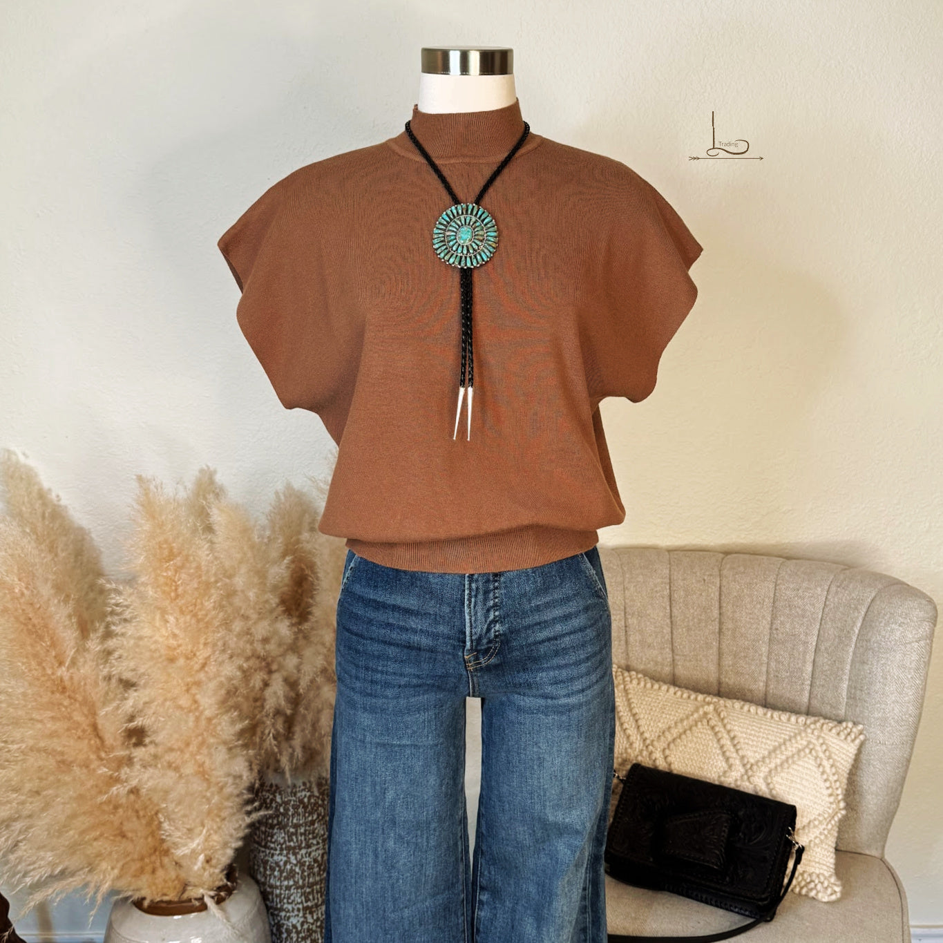 The Tandy ~A Great Basic that can be layered for the cooler months ahead! Soft Cocoa Brown in a Lightweight Knit Mock Neck~ Shown with our Turquoise Cluster Bolo Necklace, The Harley Wide Leg Jeans & The El Guantes Tooled Leather Clutch/Crossbody in Black